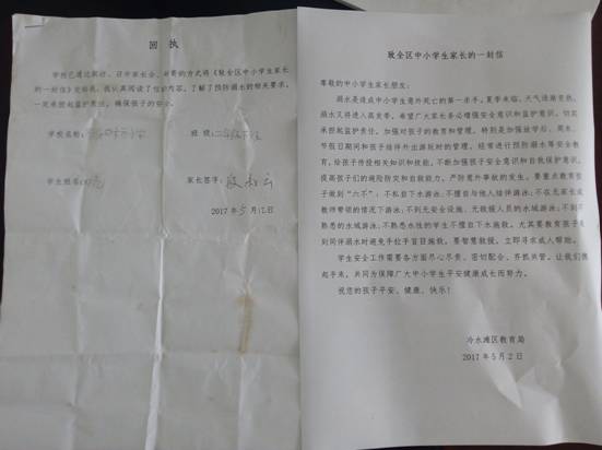 各班组织学生和家长观看完《湖南省中小学生预防溺水警示教育专题片》,并要求学生和家长在《致全体学生家长的一封信》上签字,让家长与学校共同教育好学生,确保学生安全。