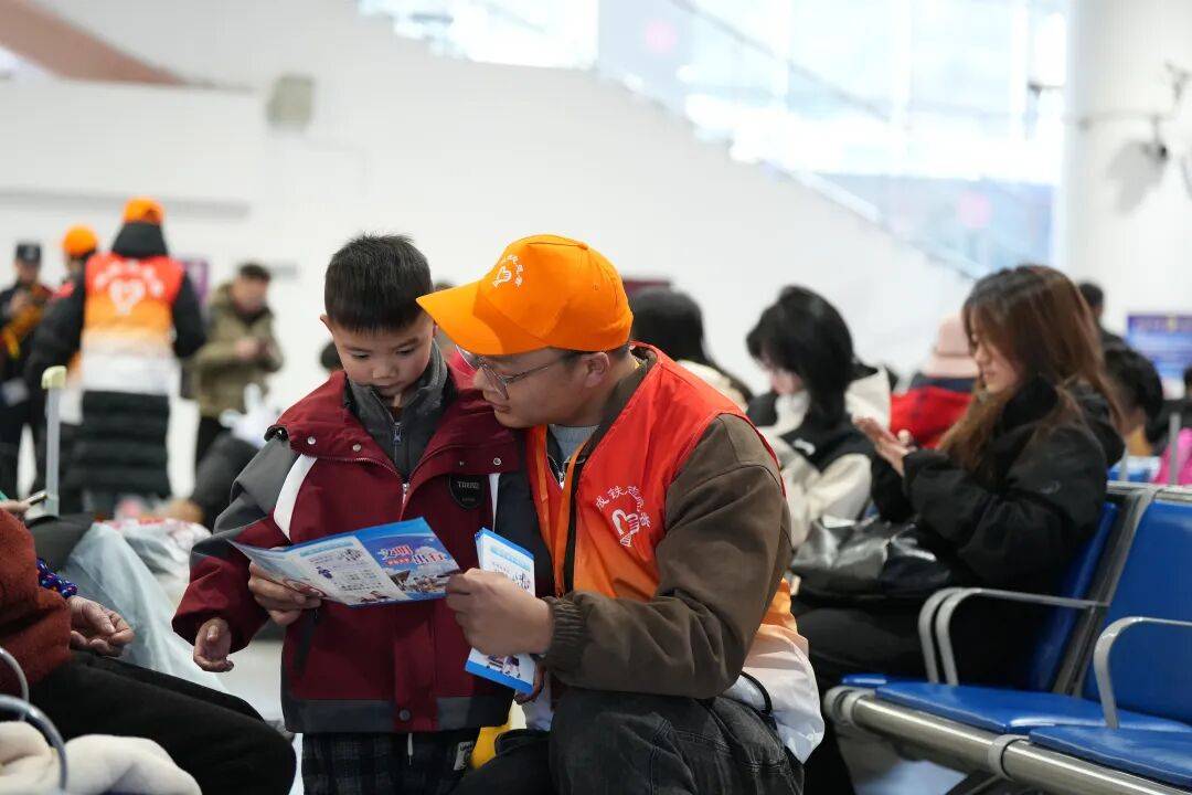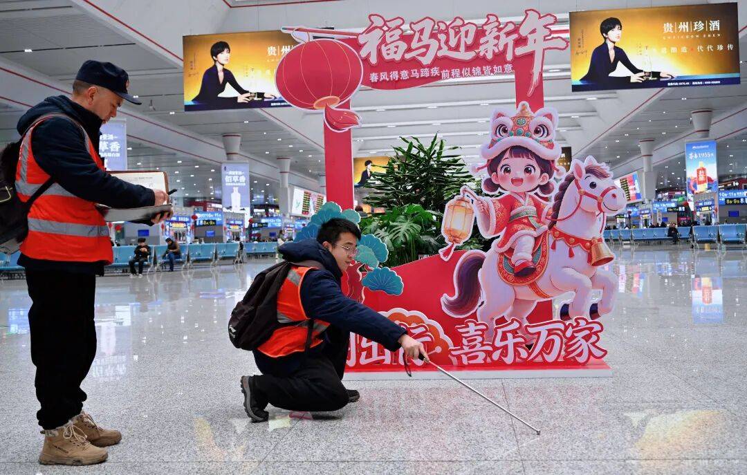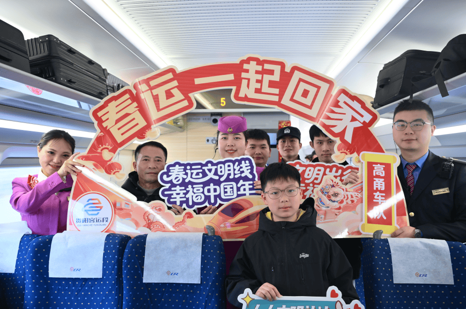 春运首日,铁路部门在贵阳北站开展快闪迎春活动,在部分车间及列车上开展了形式多样的文明宣传活动,设置互动环节吸引旅客抢答,在趣味互动中向旅客普及安全乘车、有序候车、反诈等知识,提升旅客文明出行意识与自我保护能力。在贵阳北站设置“我的铁路风景”打卡点,吸引旅客竞相拍摄打卡。在贵阳北站、龙洞堡站及部分列车上设立返乡服务点,为旅客提供手机免费除尘及贴膜等服务。继续开展“送万福、进万家”活动,由路内外书法家现场书写寓意美好的春联和“福”字,免费赠送给南来北往的旅客。特别是现场根据旅客需求定制书写的春联受到大家广泛好评。