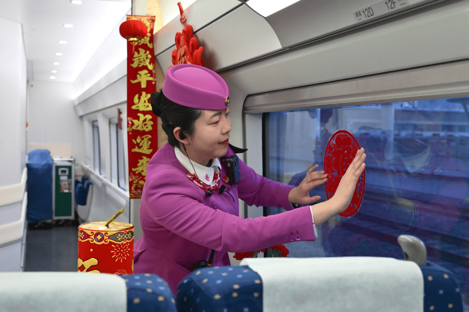 步入车厢,浓郁的年味便扑面而来。红灯笼、中国结错落悬挂,福字剪纸贴满车窗,将车厢装点成了移动的“新春小屋”。车厢连接处,“春运心愿墙”被红金两色的便签纸装点得格外喜庆,一旁的“春运一起回家”主题展板,将高铁的“快”与旅客的“盼”巧妙融合。