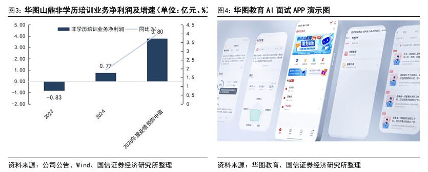 行业旺盛需求与公司产品创新共振,2025年公司业绩快速增长。2025年华图山鼎预计实现归母净利润2.8-4.2亿元,同比增长约428%-693%;区间中值为3.5亿元,对应同比增长约560%,符合我们此前预期(3.5亿元)。公司预计实现扣非后归母净利润2.58-3.87亿元,同比增长约955%-1483%;区间中值为3.23亿元,同比增长约1244%;结合此前公司三季度报披露信息,我们分析非经常性损益主要包括结构性存款利息收入及资产使用权处置收益。本次业绩预告暂未披露公司收入层面数据,我们此前预计公司2025年实现收入33.7亿元。