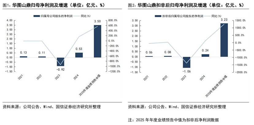 2025年华图山鼎预计实现归母净利润2.8-4.2亿元,同比增长约428%-693%;区间中值为3.5亿元,对应同比增长约560%,符合我们此前预期(3.5亿元)。预计实现扣非后归母净利2.58-3.87亿元,同比增长约955%-1483%;区间中值为3.23亿元,同比增长约1244%;结合此前公司三季度报披露信息,我们分析非经常性损益主要包括结构性存款利息收入及资产使用权处置收益。本次业绩预告暂未披露收入数据,我们此前预计公司2025年实现收入33.7亿元。