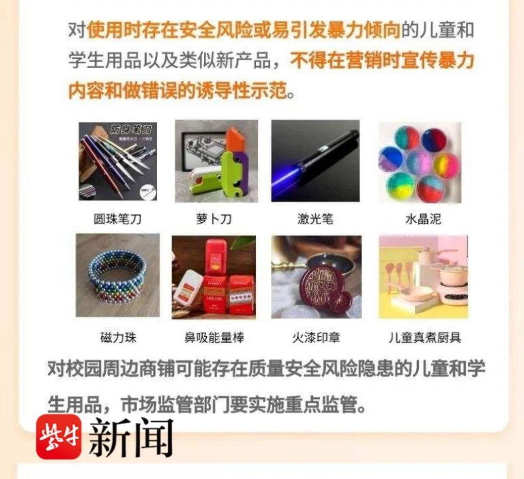 此外,记者检索发现,2024年1月,市场监管总局、教育部、工业和信息化部曾联合发布《关于加强重点儿童和学生用品安全管理的公告》。其中提到,儿童和学生用品销售单位应当严格履行产品质量安全主体责任,不得销售来源不明、无标签标识、无注意事项或注意事项不完整的产品。电商平台应当加强对平台内儿童和学生用品经营者的检查监控,禁止销售不符合法律法规和强制性标准要求的产品。“对使用时存在安全风险或易引发暴力倾向的儿童和学生用品以及类似新产品,如圆珠笔刀、萝卜刀、激光笔、水晶泥、磁力珠、鼻吸能量棒、火漆印章、儿童真煮厨具等,不得在营销时宣传暴力内容和做错误的诱导性示范。”