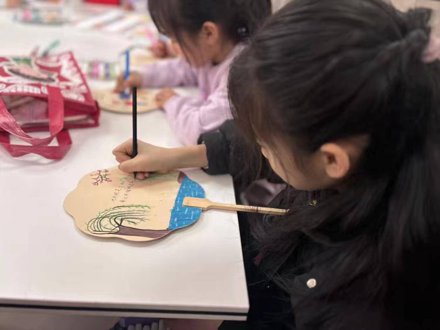 空白扇面、彩笔、墨砚一一铺开,大学生志愿者穿梭其间,引导孩子们将心中诗意落于扇上。孩子们有的题写诗句,有的以彩笔勾勒花鸟垂柳,给活动增添了童趣与才情。“孩子边玩边背了一肚子唐诗,这把扇子比买的礼物更有意义。”家长徐女士说。
