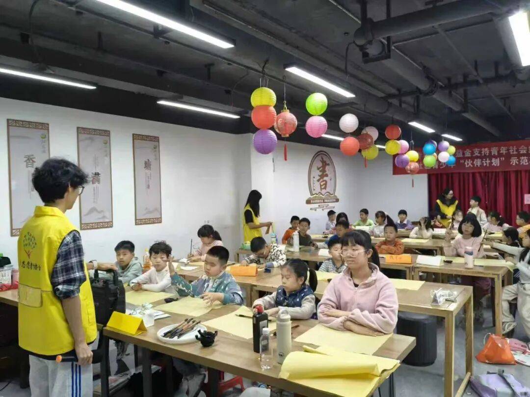“大家看,蘸墨的时候要‘点墨’,笔锋要顺,心要静……”志愿者哥哥姐姐们化身书法小老师,耐心地向孩子们讲解执笔姿势等技巧以及“点墨”等专业术语。对于大部分从未拿过毛笔的孩子,志愿者们更是手把手地进行教学,一笔一划地示范,引导孩子们感受毛笔在纸上的起伏与韵律,体验汉字线条的独特美感。